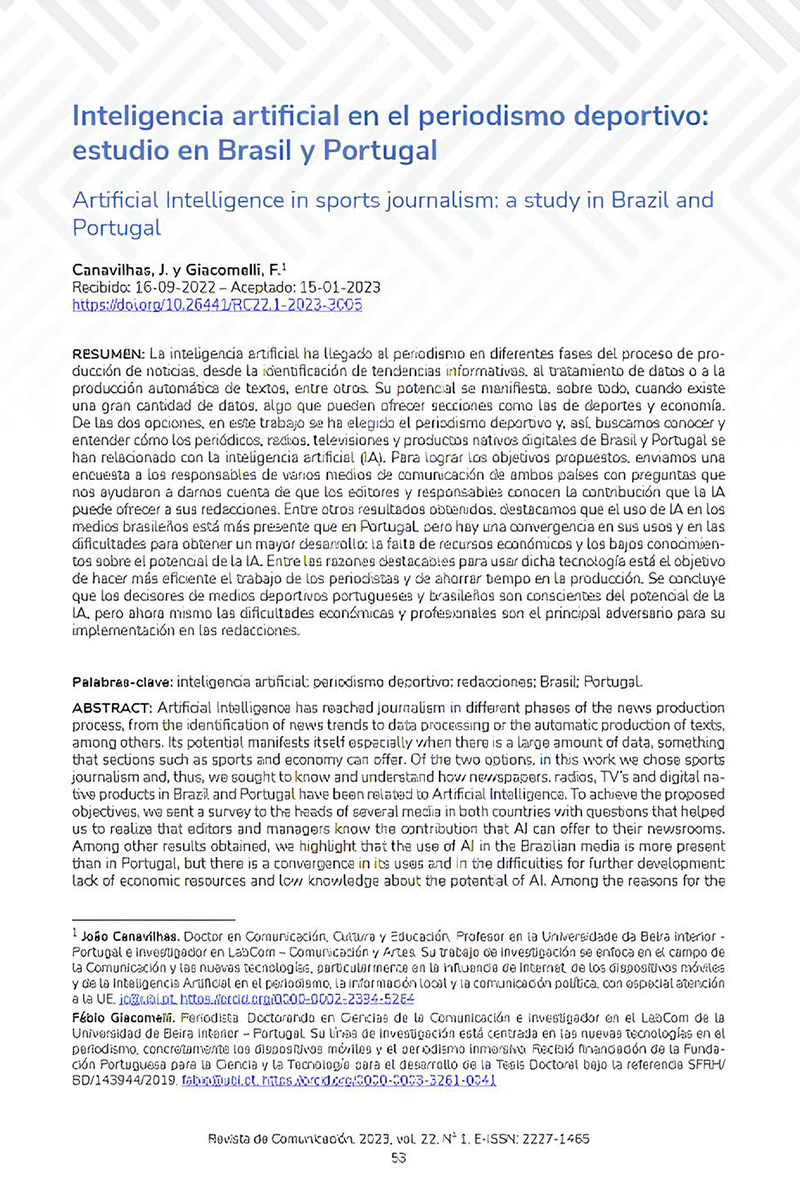 > Colección: Ciencias de la Comunicación Inteligencia artificial en el periodismo deportivo: estudio en Brasil y Portugal. Autor: Canavilhas, J., & Giacomelli, F. Año: 2023 Libro en formato digital Resumen: … Leer más