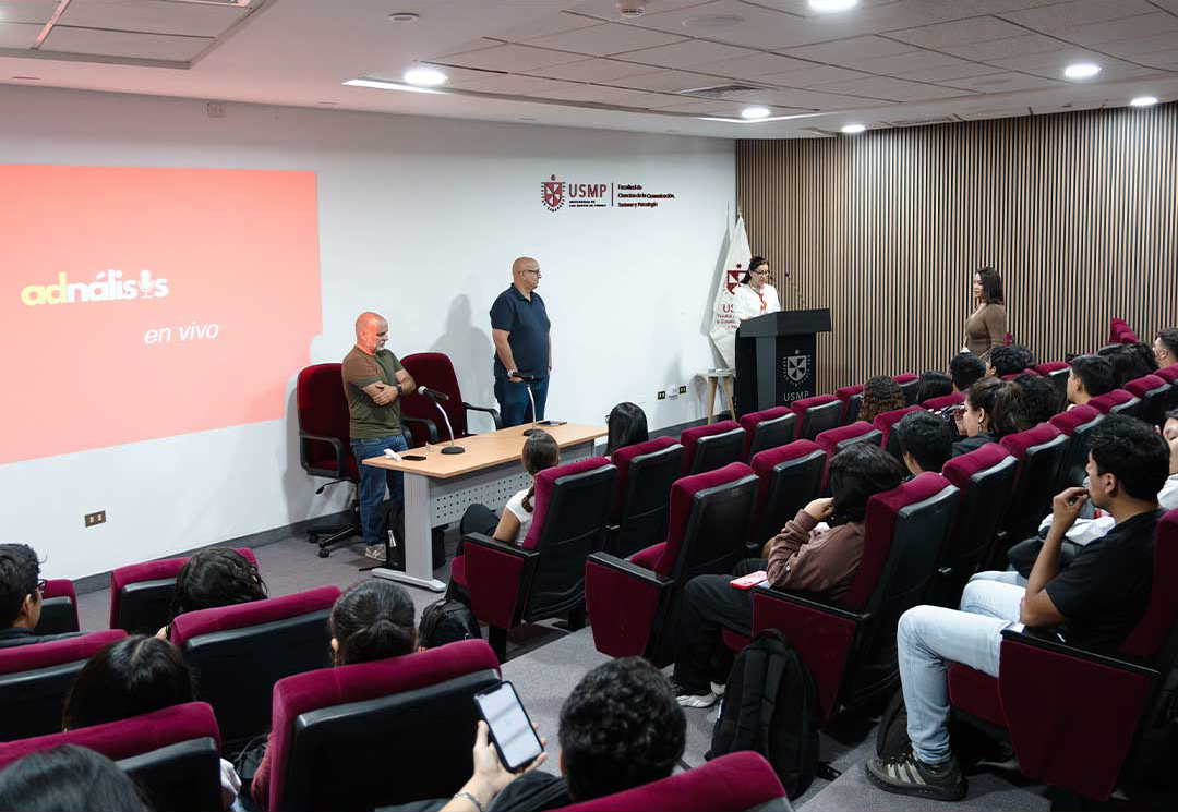 La Escuela Profesional de Ciencias de la Comunicación de la Universidad de San Martín de Porres reafirmó su compromiso con una formación vinculada al mercado profesional al desarrollar la charla académica “Creatividad en Clave de Pódcast: Conversatorio con los Creadores de Adnálisis”, dirigida a estudiantes de la especialidad de Publicidad.