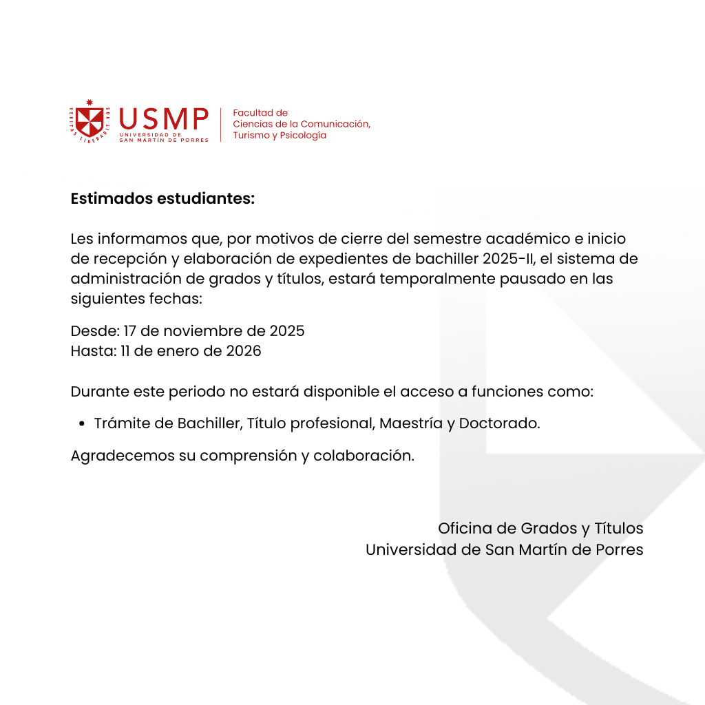 - Presentar certificado de estudio con dominio de un idioma extranjero, emitido con una antigüedad no mayor a dos años y de una institución reconocida oficialmente. Los exámenes de suficiencia de inglés y otros idiomas serán tomados exclusivamente por el Centro de Idiomas de la USMP. Esto comprende también los idiomas no enseñados en este Centro de Estudios.